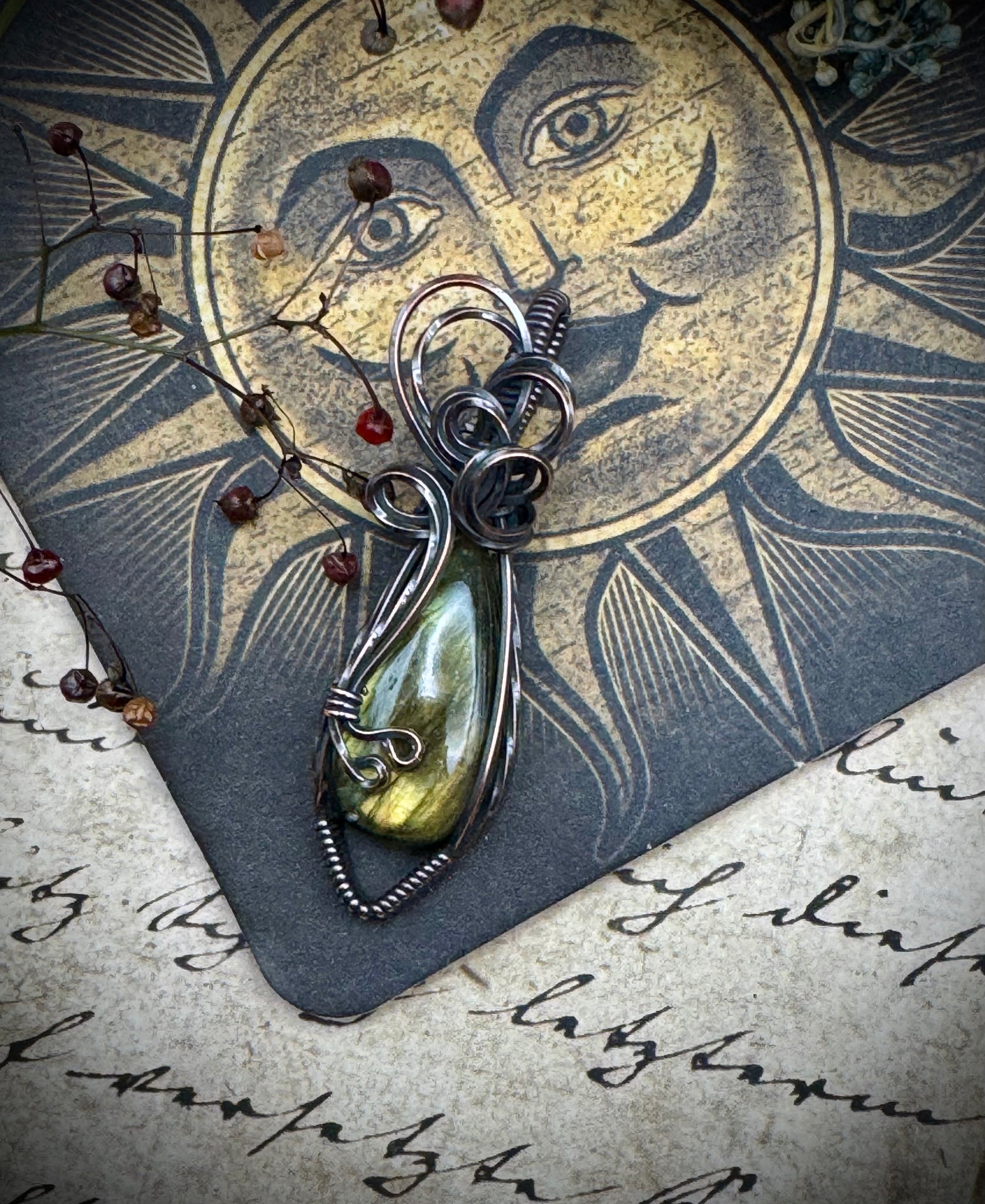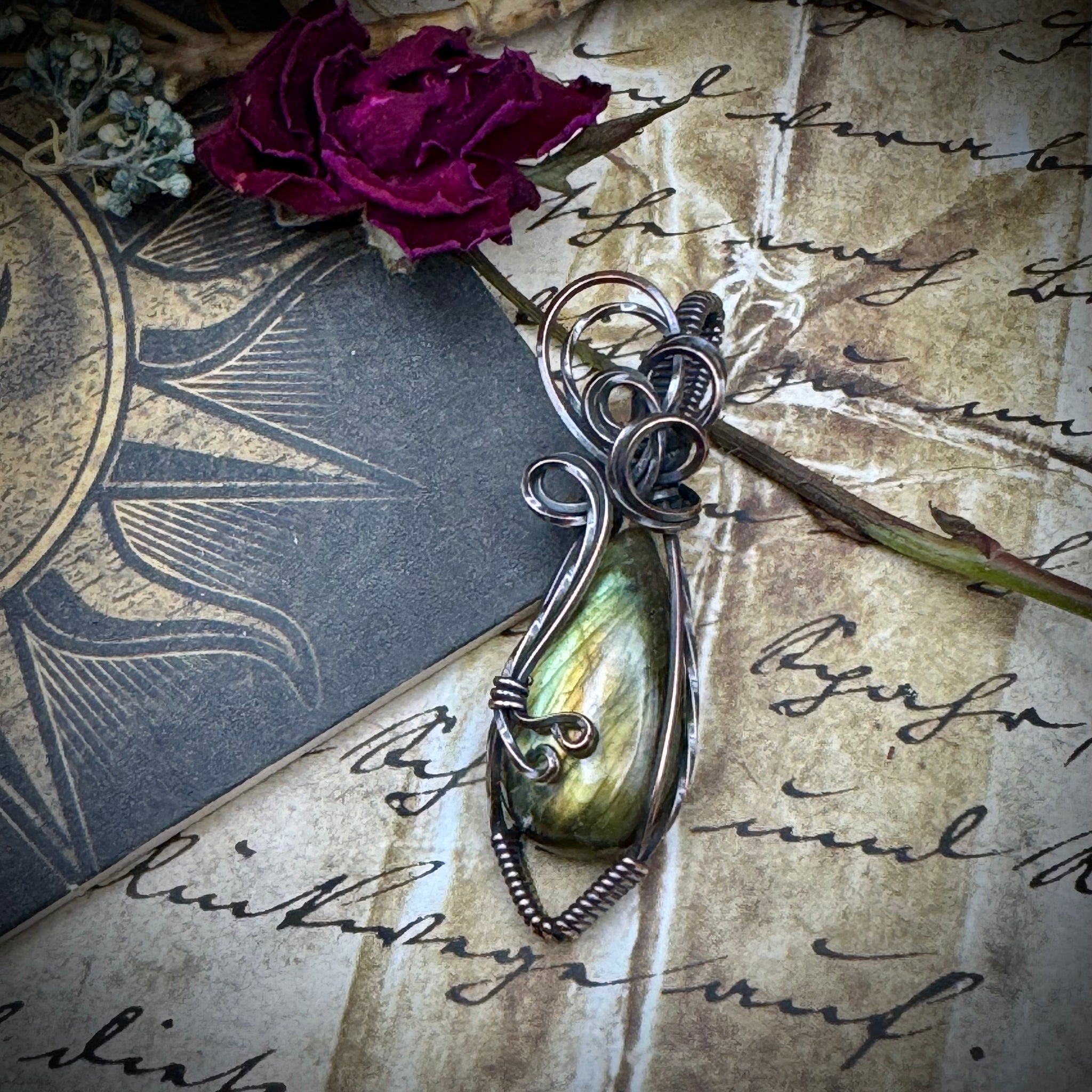 This beautiful green and gold Labradorite is wrapped up in oxidized copper wire. It measures right at 2 inches tall and will come hung on a cord necklace.