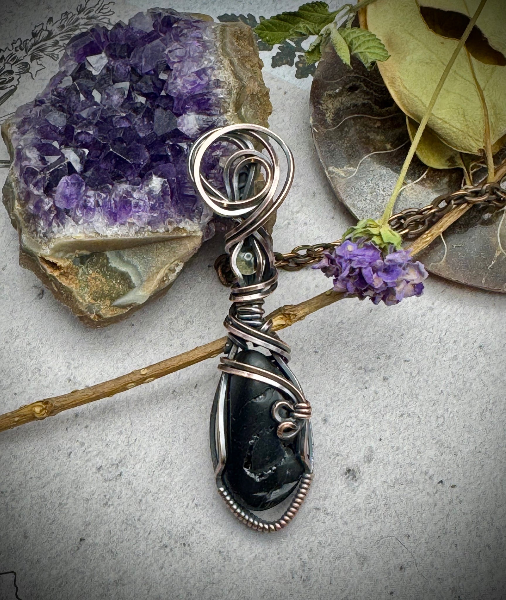 This piece features a piece of raw obsidian with a small smoky quartz accent. It is wrapped in swirls of oxidized copper wire and will come hung on a cord necklace. This piece measures 2.5 inches tall.