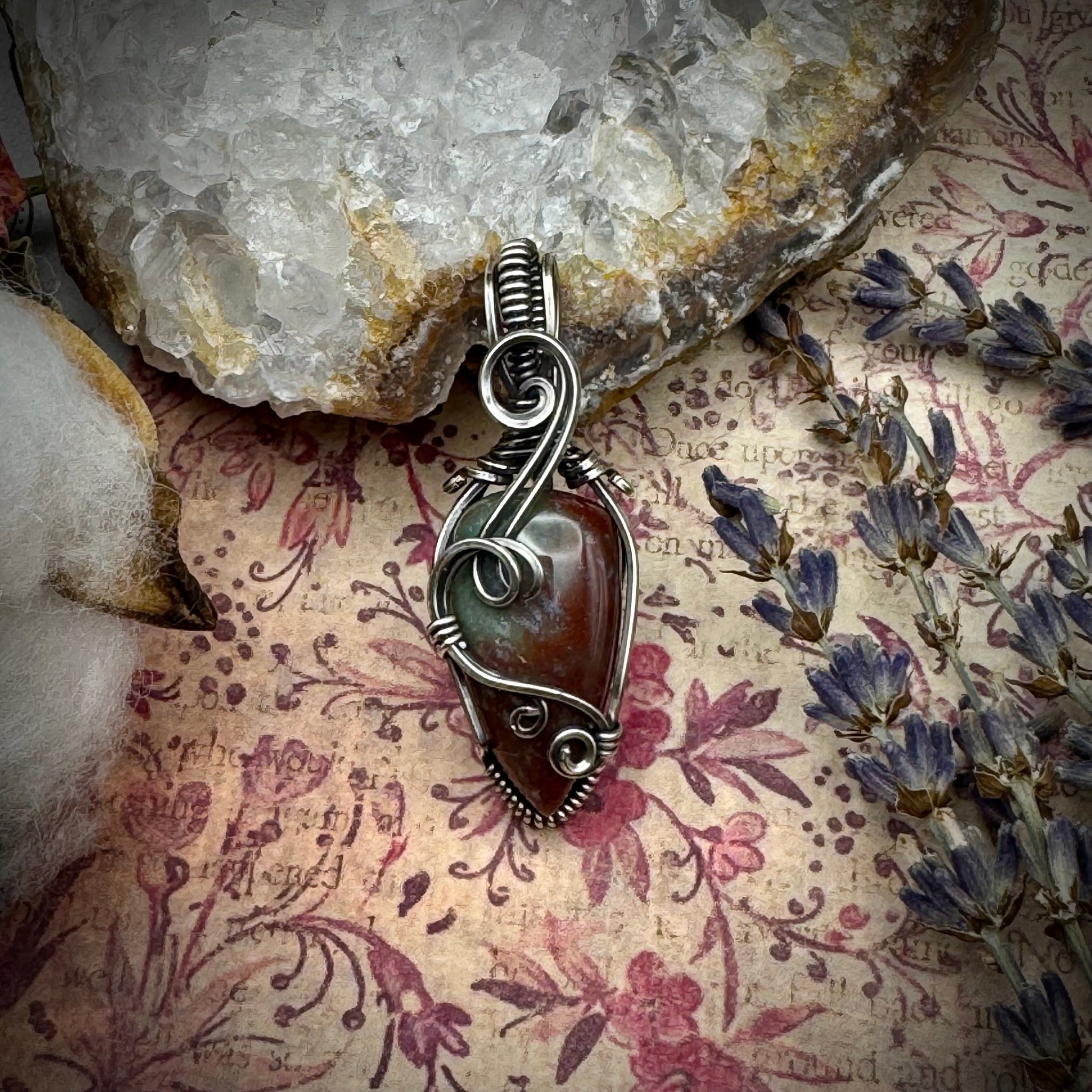 This pretty piece of Bloodstone is all dressed up in sterling silver that has been oxidized to give it an antique appearance. It measures right at 1.5 inches and will come hung on a cord necklace.